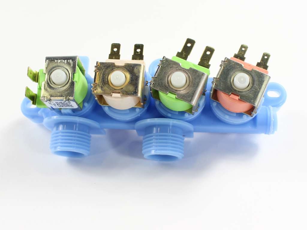 This inlet valve is designed for use in compatible top-load washing machines and plays a key role in regulating water flow during the wash cycle. Controlled by electrical signals, the valve opens and closes to allow water into the tub as needed. A malfunctioning inlet valve may prevent the washer from starting, trigger error codes, or cause water to leak into the tub, indicating the need for immediate replacement. This component features two individual valves, each equipped with its own wire terminal for proper electrical connection. Installation requires partial disassembly of the washer and basic tools such as needle-nose pliers, a socket wrench, and a screwdriver. The valve is supplied as a standalone part and does not include additional accessories.